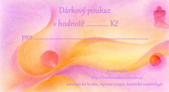 Poukaz je zhotoven andělskou automatickou kresbou a bude na něm Vámi zvolená hodnota „dárku“. Pokud budete chtít, může na něm být i jméno obdarovaného, věnování nebo varianta služby, kterou vyberete (andělská kresba, karmická numerologie, regresní terapie). Vše záleží na Vašem přání a naší vzájemné domluvě při objednání ♥. Platnost dárkového poukazu bude max 3 měsíce od jeho vystavení ♥.